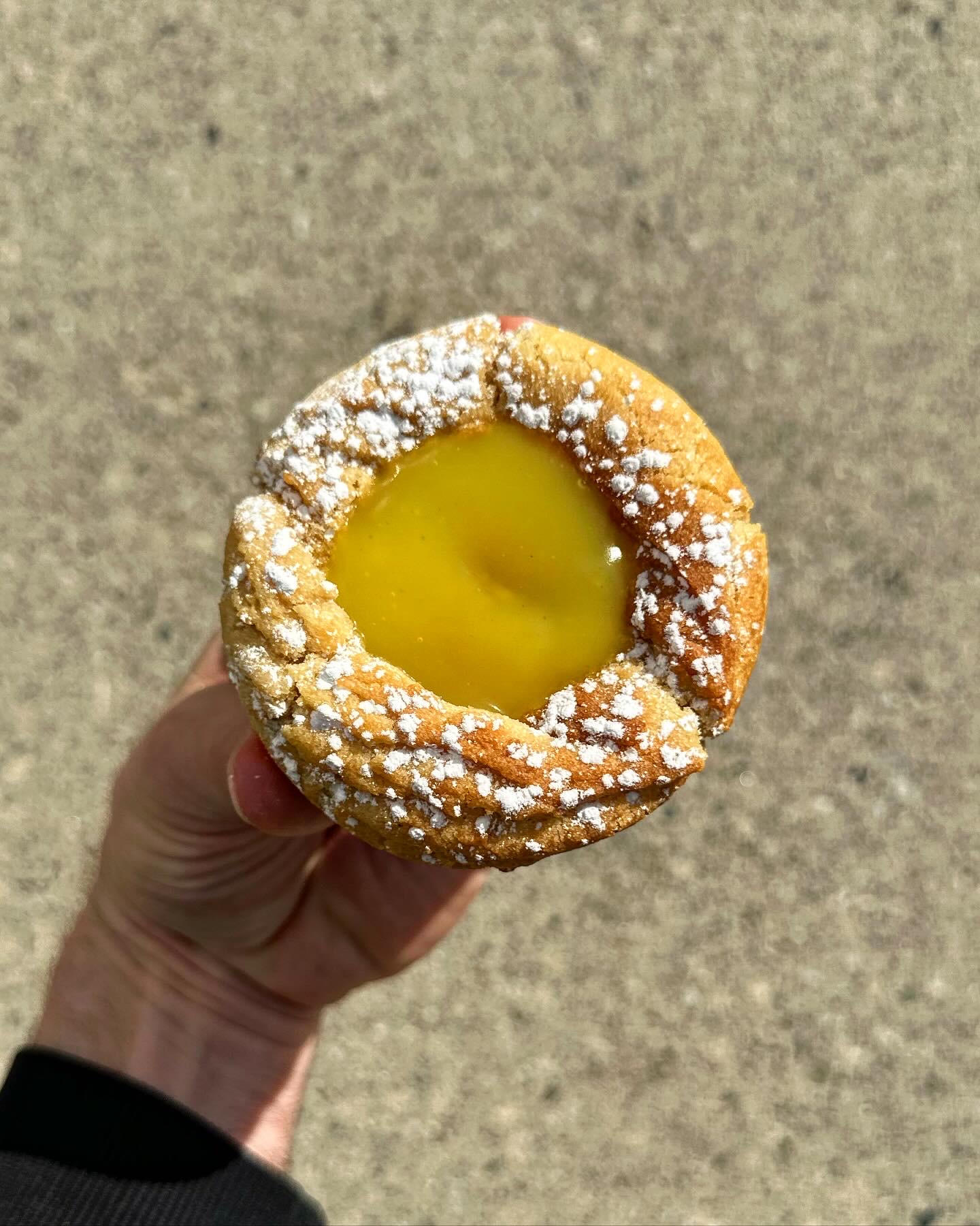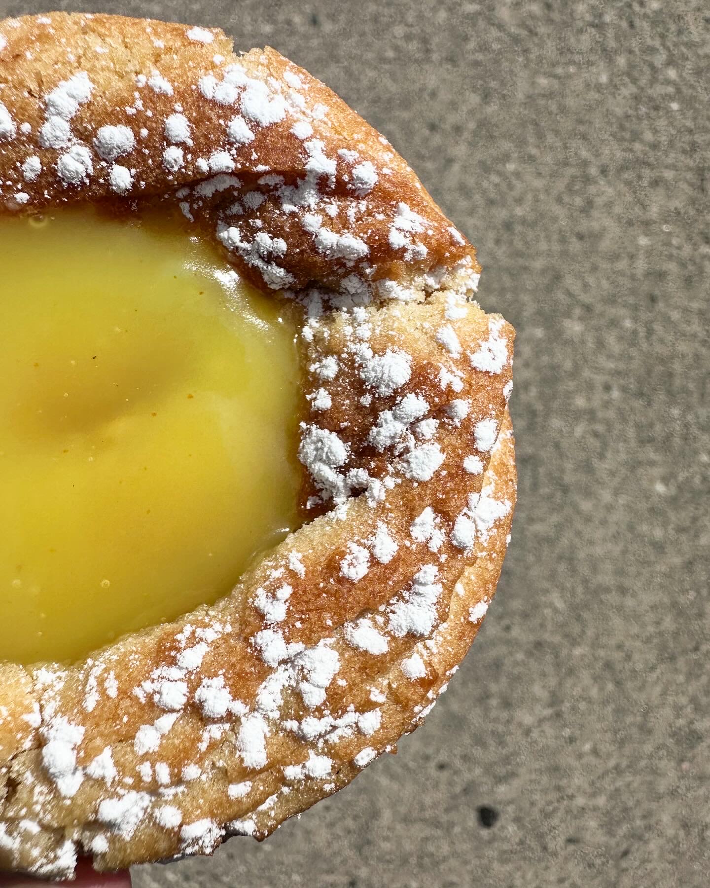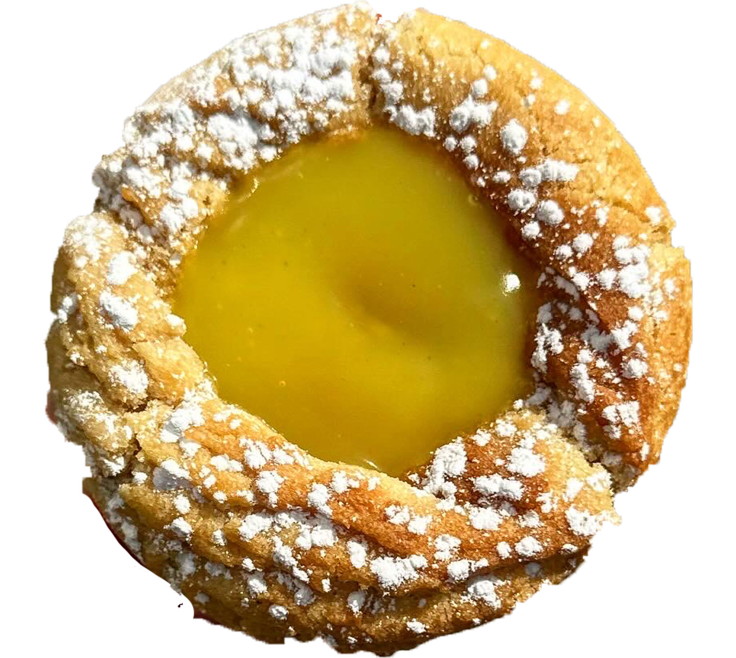 A plant-based tangy delight made with organic flour, oat milk, white and brown sugar, baking powder & margarine, finished with a light dusting of icing sugar, holding a zesty dollop of lemon-puree. Soooo good!